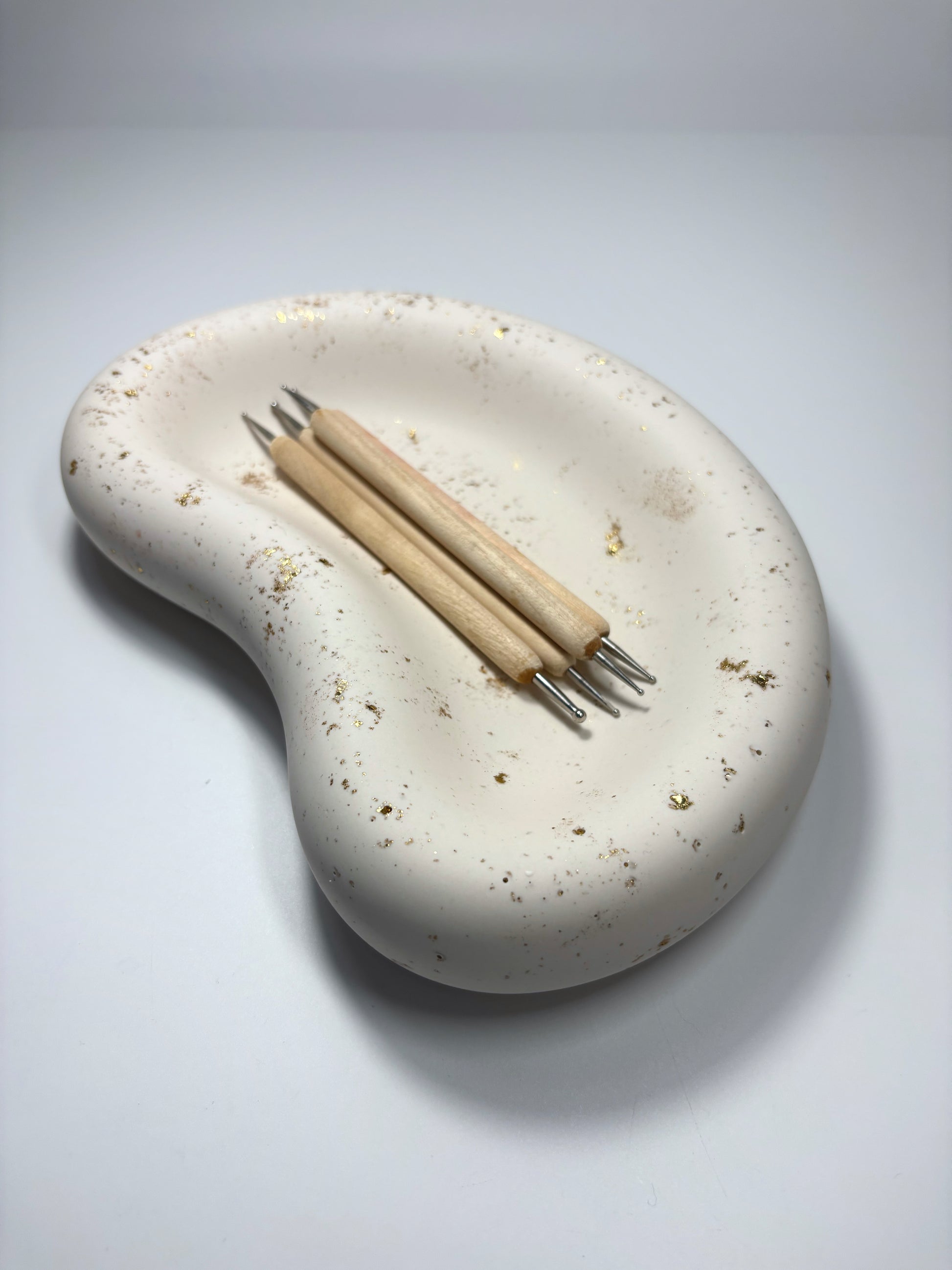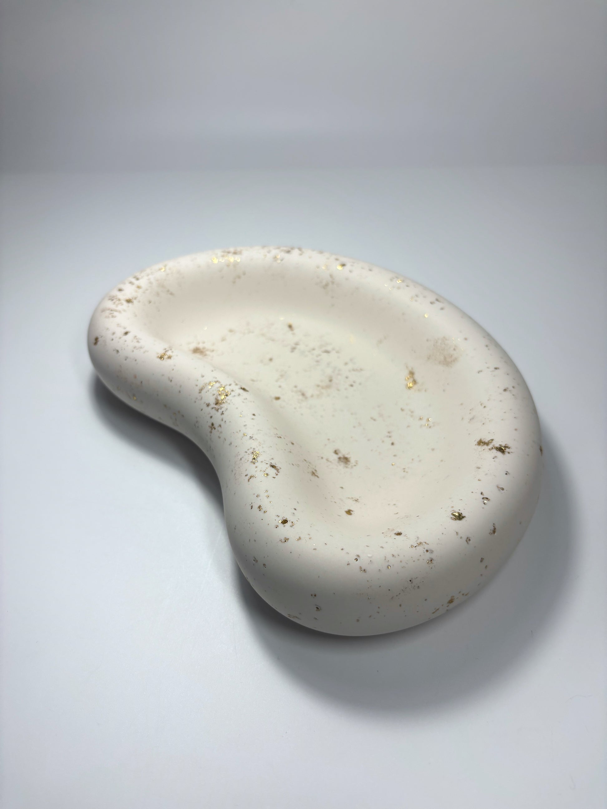 Ce plateau en Jesmonite, à la forme organique et douce, est une pièce unique conçue pour apporter une touche d’élégance à ton espace. Réalisé à la main, il allie design minimaliste et finitions raffinées avec ses éclats de feuille d’or subtilement intégrés.